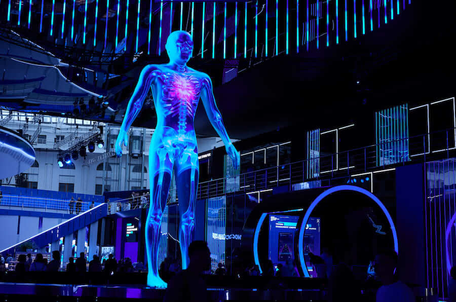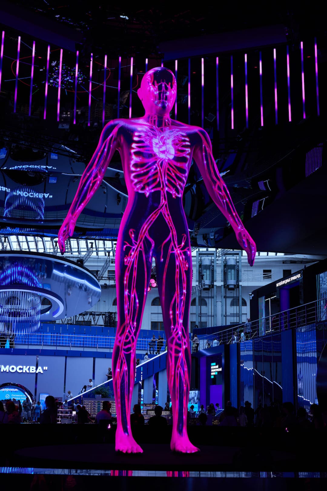 Посетителей встречает шестиметровый цифровой человек, символизирующий три главные темы площадки: здравоохранение, образование и социальные проекты. Гости могут услышать, как бьется его сердце, увидеть, как создаются нейронные связи в головном мозге, как работают легкие человека и многое другое.