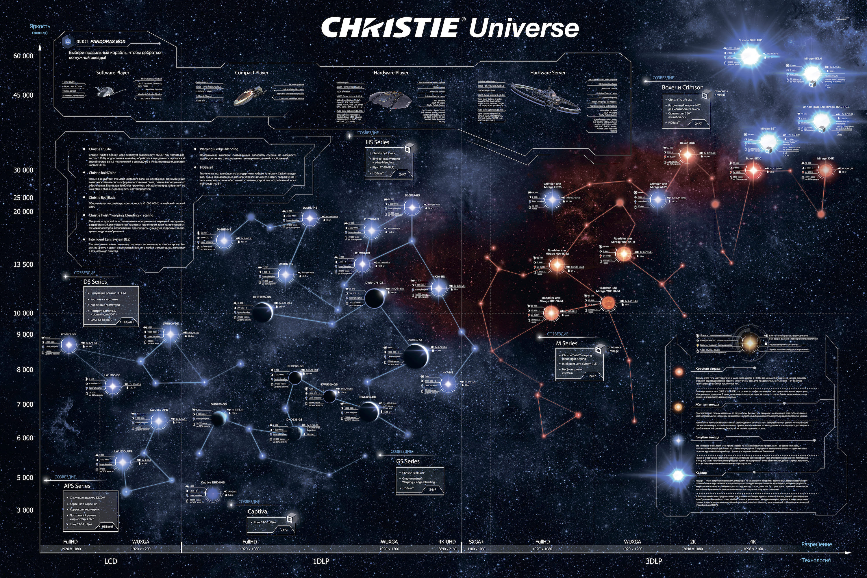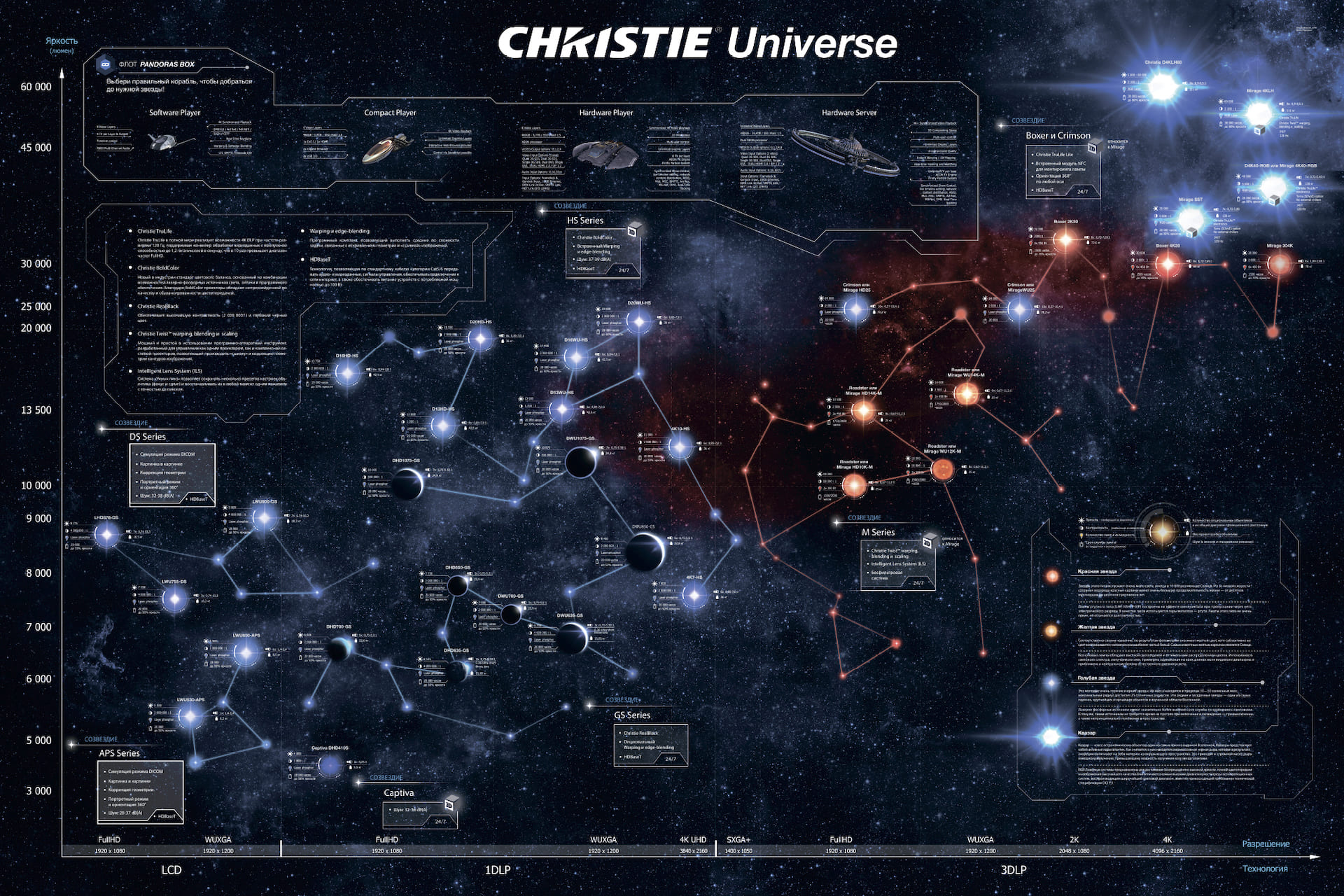 Вселенная Christie показывает всю линейку LCD, 1DLP и 3DLP проекторов Christie от 4’000 до 60’000 lumen.